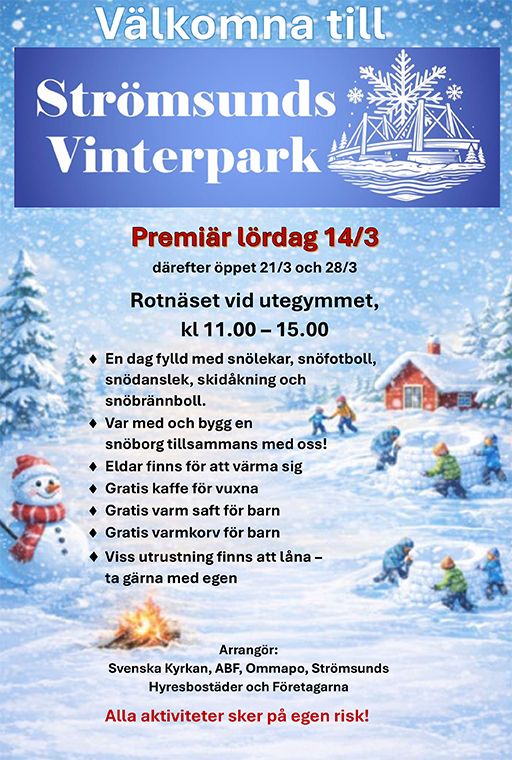 Strömsunds hyresbostäder bjuder tillsammans med lokala samarbetspartners in till premiären av Strömsunds vinterpark den 14 mars. Friluftsliv, lek och social gemenskap står i centrum. Välkommen!